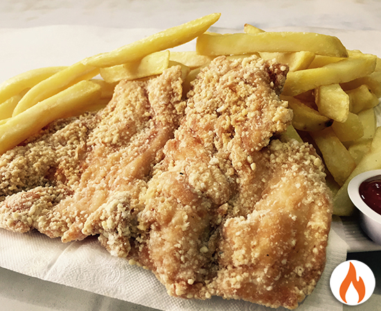 pechuga de pollo apanada frita, muy crujiente, muy jugoso, puede ser picante o sin picante.