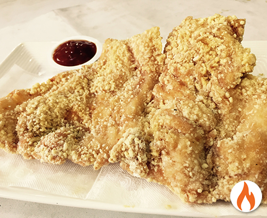 trocitos de pollo apanado frito, puede ser picante o sin picante.